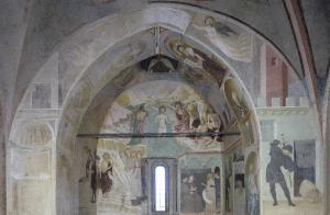 - NOTIZIE STORICO CRITICHE Il Battistero fa parte del complesso della Collegiata di Castiglione Olona: è un edificio ricavato da una delle torri dell'antico castello fortificato, già trasformata in una cappella gentilizia intitolata a san Pietro. La dedicazione di questo ambiente a San Giovanni Battista risale agli interventi di abbellimento e ammodernamento del borgo promossi dal cardinal Branda Castiglioni che hanno previsto dapprima, nel 1425, la ricostruzione della chiesa parrocchiale o Collegiata, dedicata alla Beata Vergine Maria e ai martiri Stefano e Lorenzo, insieme alla fondazione di un collegio per l'istruzione dei giovani e all'edificazione ex novo della chiesa di Villa a partire dal 1437.\nLa scoperta degli affreschi al suo interno è avvenuta solo nel 1843, sotto a scialbature applicate alla fine del Settecento; l'iscrizione "MCCCCXXXV" (1435) riportata sull'intradosso dell'arco absidale è considerata non coeva ma cronologicamente attendibile circa la data della loro esecuzione. Si tratta di un capolavoro di grande complessità linguistica e insieme di intonazione cortese, anche se già pervaso di novità rinascimentali, opera di Masolino da Panicale. L'artista, formatosi presso la scuola del Ghiberti, prima di allora si era dedicato prevalentemente all'attività di pittore e frescante nella cappella Brancacci della chiesa di S. Maria del Carmine a Firenze, in S. Clemente a Roma e nella casa Orsini a Montegiordano. \nNegli affreschi del Battistero Mascolino compendia tutto se stesso, dando conto al proprio repertorio: ricercatezze prospettiche, gusto aneddotico ed eleganze mondane, una materia pittorica delicata e sottile, anche se purtroppo giunta ad oggi in uno stato di conservazione non sempre ottimale. Soprattutto nella parete del "Battesimo" l'artista riesce a mediare la visione tardogotica di Gentile da Fabriano, tanto caro all'ambiente lombardo, con il rinnovato linguaggio toscano di cui si propone importatore. Sia nell'impostazione generale, sia nella disposizione delle scene, si riscontra infatti la ripresa delle fonti più disparate: dalle tipologie masaccesche, forse memoria di schemi e disegni preparati per Masaccio e poi non realizzati ai tempi della collaborazione nella Cappella Brancacci, ai modelli dall'antico costituiti da sarcofagi o statue celebri, fino addirittura agli spunti da alcune figure visibili negli affreschi di S. Maria foris Portas nella vicina Castelseprio.\nUn esempio su tutti, la presenza accanto alla figura elegantemente monumentale del Cristo e a quella del Battista di quattro neofiti che hanno ricevuto il battesimo o sono sul punto di riceverlo. Tra di essi si distinguono un uomo seduto che si sta sfilando le scarpe con atteggiamento ravvicinabile al modello dello "Spinario", modello classico a cui era ricorso anche il Ghiberti per la creazione di Adamo nella Porta del Paradiso; un altro personaggio che sta per restare scalzo, e, tra le figure di più grande inventiva, un giovane visto di spalle con la testa nascosta dalla camicia, forse ispirata a un particolare presente su un sarcofago con Amazzonomachia a Roma. \nPer quanto invece riguarda la scena successiva, il deserto in cui il Battista predica è frequentato da uomini insolitamente alla moda, evidentemente ispirati al gusto fastoso di Gentile da Fabriano e Pisanello, di fatto lontani dall'austerità della pittura fiorentina; alle loro opere deve essere ricondotta anche la presenza (oggi purtroppo ridotta solo ad una traccia) nelle armature, nelle vesti e nelle corone, di oro e argento, utili ad impreziosire ulteriormente la stesura pittorica.\nLa critica ha discusso molto della possibilità della partecipazione di aiuti o di altri artisti alla realizzazione degli affreschi del Battistero, e in questa parete in particolare, sono stati rilevati almeno due interventi attribuibili ad una mano differente da quella di Masolino. Nella scena in cui Gesù viene presentato alle folle, lui e gli apostoli si dispongono a semicerchio, creando così un vuoto tra essi e il Battista, che originariamente era occupato solo da una enorme roccia: tale spazio fu in un momento successivo riempito da un secondo artista che tolse parte dell'intonaco originale per dipingere il profilo di un personaggio con un grande cappello, oggi profondamente lacunoso, al punto che ne resta visibile soltanto il volto. Il richiamo molto forte a Pisanello nella trattazione di questo viso, avrebbe fatto pensare ad un autore riconducibile alla sua bottega, quale Domenico Veneziano oppure Bono da Ferrara. Per quanto invece riguarda l'architettura dipinta che fa da sfondo alle due figure di Erode ed Erodiade, la perfetta prospettiva e l'ostentazione di una tipica architettura gotica senese ha portato la critica a fare il nome di Lorenzo di Pietro, detto il Vecchietta, attivo per il cardinale committente anche nella cappella all'interno della sua residenza castiglionese, Palazzo Branda.