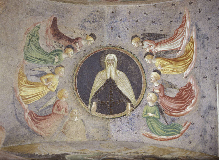 La copertura della zona dell'altare del Battistero, ideale proseguimento della parete di fondo, è affrescata con l'immagine di Dio Padre, originariamente vestito di argento e oro all'interno di un tondo argenteo (le lamine metalliche sono ad oggi andate perdute), in posizione frontale, con una lunga barba bianca divisa a metà, le spalle coperte da un candido manto e le braccia aperte protese verso il basso. Egli sembra infatti aver appena liberato la colomba, simbolo dello Spirito Santo, che appare volteggiante sulla testa del figlio mentre viene battezzato nell'affresco della parete sottostante. La mandorla è di forma perfettamente circolare, con un profilo costituito da più strisce di differenti colori (oggi difficilmente leggibili) da cui viene emanata la luce sotto forma di minuscoli raggi dorati. Sullo sfondo azzurro punteggiato di stelle, si dispongono due schiere di quattro angeli ciascuno, abbigliati con abiti dalle sgargianti cromie, rivolti verso il Signore con le mani giunte vicino al petto. Ognuno di essi appare inginocchiato su una nuvola rosata e orientato in maniera tale da creare un altro cerchio intorno alla mandorla divina. Sul lato sinistro della composizione, compare nella parte bassa un quinto angelo, un'aggiunta effettuata dalla mano di un secondo artista.