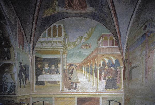 - NOTIZIE STORICO CRITICHE Il Battistero fa parte del complesso della Collegiata di Castiglione Olona: originariamente ricavato da una delle torri dell'antico castello fortificato, la dedicazione di questo ambiente a San Giovanni Battista risale agli interventi di abbellimento e ammodernamento del borgo promossi dal cardinal Branda Castiglioni che, a partire dal 1425, fece ricostruire la chiesa parrocchiale o Collegiata, fondò un collegio per l'istruzione dei giovani e fece edificare ex novo la chiesa di Villa.\nLa scoperta al suo interno di uno dei più importanti cicli di affreschi del Quattrocento italiano, opera di Masolino da Panicale, è avvenuta solo nel 1843, sotto a scialbature applicate alla fine del Settecento; l'iscrizione "MCCCCXXXV" (1435) riportata sull'intradosso dell'arco absidale è considerata non coeva ma cronologicamente attendibile circa la data della loro esecuzione.\nLa decorazione interna è organizzata in modo unitario e si estende a tutto l'ambiente, così che ogni parete accolga una o più scene provviste di punto di fuga centrale, confluenti cioè nell'ideale posizione dello spettatore al centro dell'edificio. Le vicende sono narrate con impostazione didascalica utilizzando la scomposizione di uno stesso riquadro per suggerire la successione temporale di azioni riferibili al medesimo racconto.\nLe forti caratterizzazioni dei convitati della parete qui schedata hanno portato la critica a ravvisarvi ritratti di contemporanei: seguendo le tesi più diffuse, il personaggio di Erode ritrarrebbe Niccolò III d'Este o Filippo Maria Visconti; il personaggio con capelli bianchi, lo stesso cardinal Branda; il giovane biondo con baffi, Pippo Spano o Giovanni Hunyadi, entrambi condottieri dell'epoca. Risulta ben riuscito il tentativo di realizzare un efficace equilibrio tra le figure e le architetture, cui è affidato il compito di stabilire i nessi necessari per guidare lo spettatore nella lettura delle scene; colpisce inoltre la sobrietà e la chiarezza descrittiva dei gesti e dei costumi caratterizzanti i diversi personaggi dai morbidi incarnati e di una bellezza assorta. Da un esame ravvicinato è emersa la presenza di foglie o lamine metalliche direttamente applicate sul fondo talvolta con residui d'oro, sgraffiate con incisioni fitte a mano libera specie in corrispondenza di drappi e di vesti per imitare le maglie delle armature o gli arabeschi dei tessuti, che pare confermare l'esecuzione di dorature, tecnica che si ritrova ovunque nel ciclo con lo scopo di amplificare gli effetti materici e luministici già piuttosto evidenti.