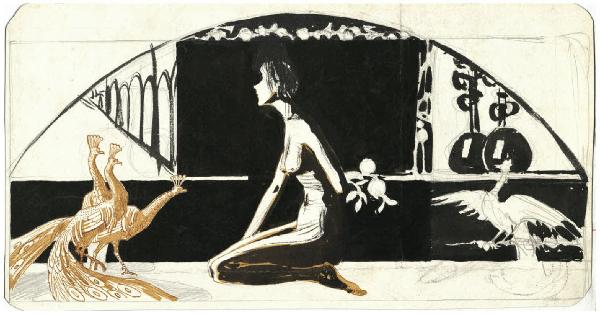 Interno con nudo femminile e pavoni
