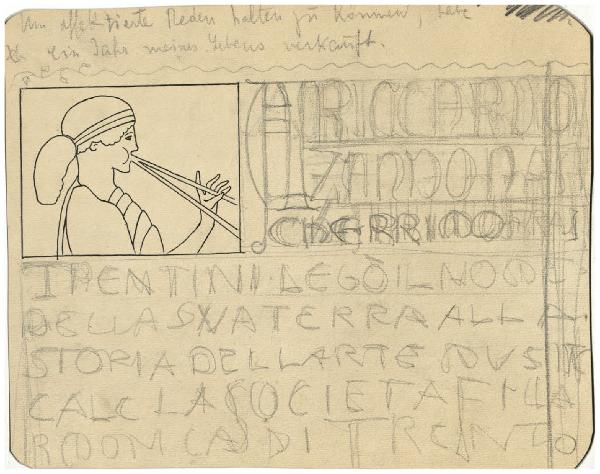 Figura femminile che suona l'aulos e iscrizione: Riccardo Zandona [?] trentini legò il nodo della sua terra alla storia dell'arte [?] la Società Filarmonica di Trento