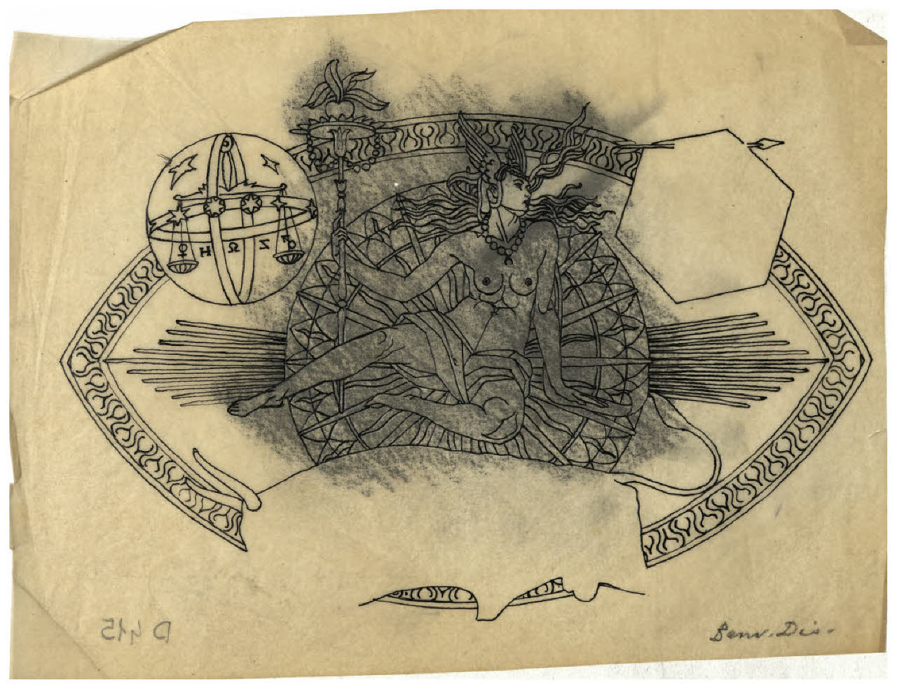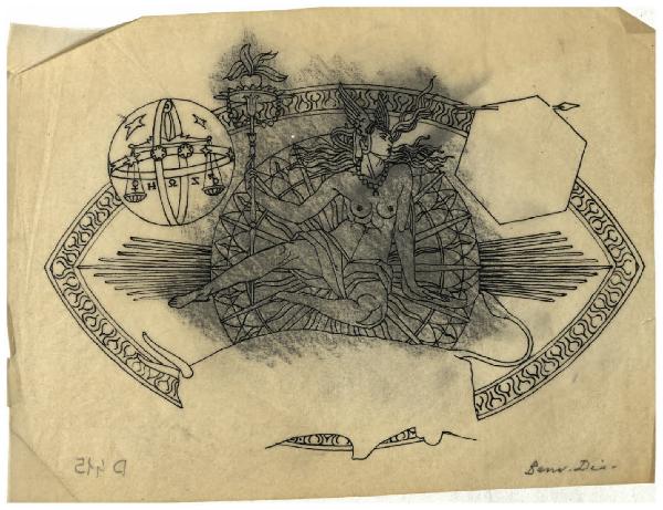 - NOTIZIE STORICO CRITICHE Questo disegno afferisce alla genesi dell'acquaforte Il Pianeta Venere (Bellini-Alberti 45). L'incisione è datata in lastra 1924 e in quell'anno fu esposta alla Biennale di Venezia. Le diverse fasi di elaborazione sono attestate da almeno un'ottantina di fogli nel Fondo Disertori del Gabinetto dei Disegni del Castello Sforzesco. Se si presta fede a quanto riferito dall'artista in un profilo autobiografico pubblicato da Riccardo Maroni nel 1954 (p. 28) la prima idea per una serie dedicata ai sette pianeti, a partire da Venere, risalirebbe al periodo in cui si trovava a Firenze (dove si era trasferito nel 1923). Questa cronologia sembrerebbe confermata da una nota manoscritta, "Firenze 1923" presente su almeno tre disegni, oggi conservati al Mart (inv. 2117, 2780, 2779; cat. Bellini-Alberti, fig. 45/a, 45/c e 45/d a p. 61). Non si spiega pertanto la data MDMXXI presente su inv. FD D 453. Difficile dire se tutti i disegni di nudo femminile che si propone qui di leggere in relazione con la preparazione dell'acquaforte risalgano proprio a questo momento, oppure se alcuni fossero precedenti. La veduta in basso è ispirata a San Gimignano, animata da una quantità di macchine belliche in molti casi ispirate al De re militari di Valturio. Nel cielo, entro una mandorla di luce Venere è assisa con in mano lo scettro, circondata dai segni zodiacali del Toro (sua casa principale), della Bilancia (casa secondaria) e infine di Cupido, che Disertori ha tratto da un bulino di Cristofano Robetta.