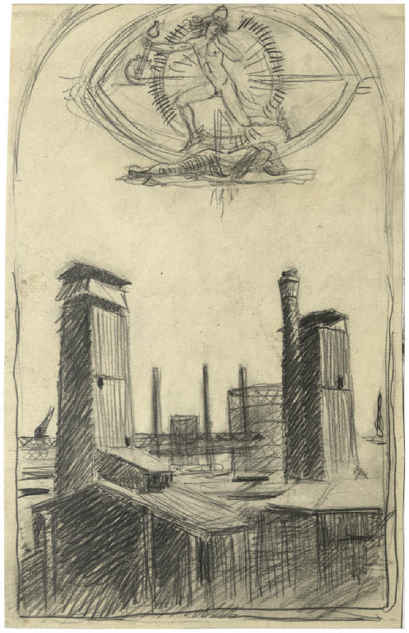 - NOTIZIE STORICO CRITICHE Questo disegno è in relazione con la genesi dell'acquaforte del 1947-1948 Il Pianeta Mercurio (Bellini-Alberti 61). La stampa mostra nella parte inferiore una veduta della zona industriale della Bovisa (per la quale si rinvia al contributo di Andrea Disertori, 2010) e nel cielo il Pianeta Mercurio in una posa scattante (simile a quella già esperita nel progetto del francobollo per la posta aerea del 1930; cfr. Salierno 1981) affiancato dai segni zodiacali della sua casa principale, la Vergine, e quella secondaria, i Gemelli. Attraverso il Fondo Disertori del Gabinetto dei Disegni del Castello Sforzesco si può seguire la genesi del soggetto, dai primi schizzi per la composizione, fino ai più analitici studi di dettaglio, compresa una serie di calchi su carta da lucido, dei quali ancora non è ben chiara la funzione.