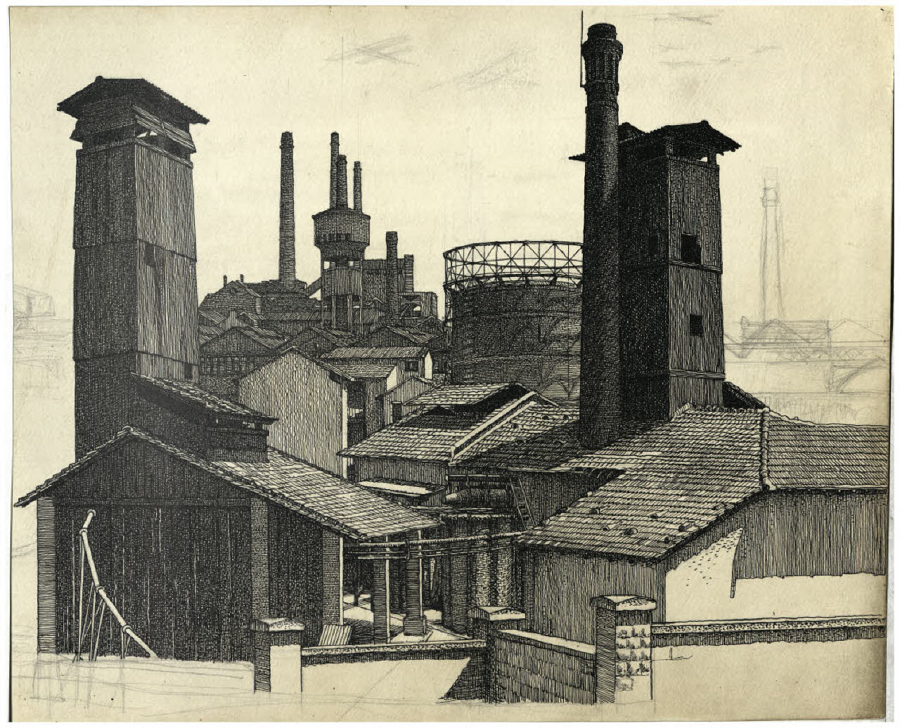 Area industriale della Bovisa. Disegno preparatorio per l'acquaforte Il Pianeta Mercurio
