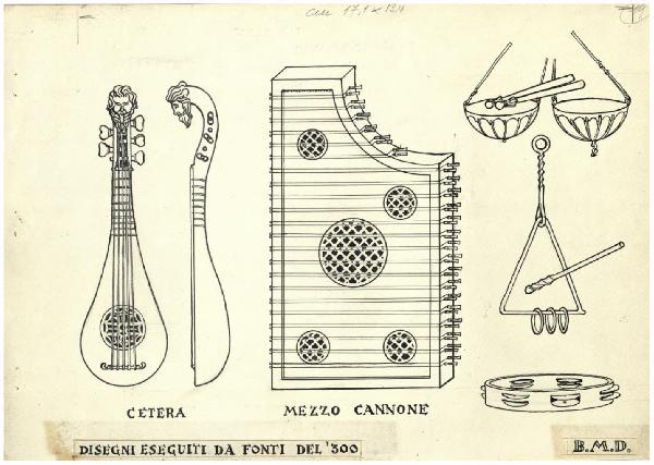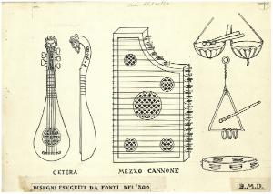 Strumenti musicali - Cetera; Mezzo cannone (Disegni eseguiti da fonti del '300). Studio per illustrazione
