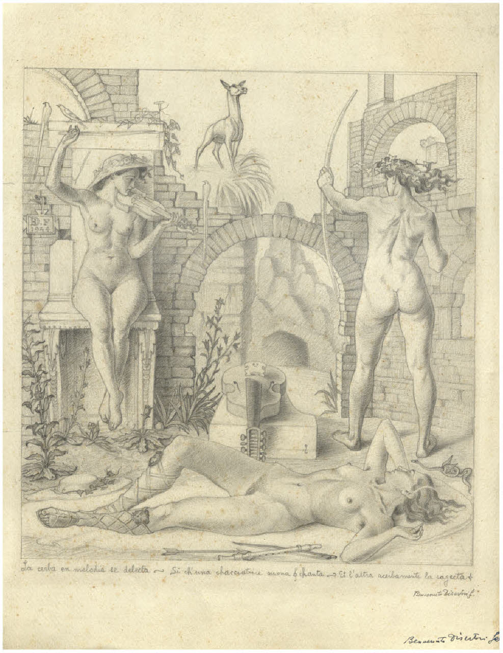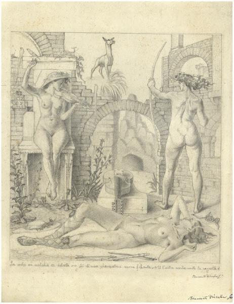 - NOTIZIE STORICO CRITICHE Nel 1950 Benvenuto Disertori ha presentato alla Biennale di Venezia un disegno dal titolo La cerba, datato 1944, raffigurante una scena dal contenuto enigmatico ambientata tra le rovine di una dimora, ispirata ad un verso dell'omonimo poema di Cecco d'Ascoli "La cerba en melodia se delecta, Si ch'una chacciatrice suona et chanta, et l'altra acerbamente la sajecta". Protagoniste della scena sono tre figure femminili nude: a destra una che sta per lanciare una freccia ad una cerva, a sinistra una seduta mentre suona il violino, infine l'ultima è distesa in primo piano. Il disegno fa oggi parte del Fondo Disertori al Gabinetto dei Disegni del Castello Sforzesco (inv. FD D 478; per un approfondimento cfr. G. Ricagni, La Cerba: l'enigma di un'allegoria, in "Grafica d'arte", 2003, pp. 30-32). Nella stessa collezione si conservano diversi studi per la composizione nel suo insieme oppure studi di figura. In stretta relazione con il soggetto di questo disegno sono due incisioni, entrambe rarissime e apparentemente non terminate (inv. FD S 10, Bellini-Alberti 53; FD S 17, Bellini-Alberti 57). Il legame tra tutte le opere riferibili in qualche modo al progetto La cerba non risulta, allo stato degli studi, adeguatamente documentato per le oggettive difficoltà a visionare, quando si trovavano nella collezione di Andrea Disertori, l'intera sequenza dei materiali. Non è da escludere che tutto fosse finalizzato alla realizzazione di un'incisione, di cui le due piccole lastre avrebbero potuto costituire un primo tentativo di traduzione sul rame. Per questa ragione, a questo primo livello di catalogazione, si propone per tutto il nucleo La cerba una datazione verso il 1944.