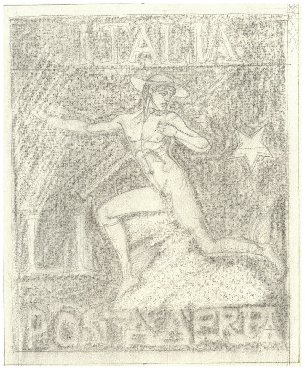 - NOTIZIE STORICO CRITICHE Il disegno è riferibile al progetto sottoposto da Disertori alla commmissione (nominata nel maggio del 1925) per la prima serie originale di francobolli per la Posta Aerea, emessa nel 1930. I due bozzetti di Disertori, che avevano come soggetto rispettivamente il dio Mercurio e una cicogna con una lettera nel becco, sarebbero stati tra quelli scelti dalla commissione ma non utilizzati (V. Salierno, Due bozzetti inediti di Benvenuto Disertori per la serie di Posta Aerea del 1930, in "Il Nuovo Corriere Filatelico", 1981, n. 33, pp. 30-31). I bozzetti conservati nel Fondo Disertori del Gabinetto dei Disegni non corrispondono alla versione definitiva (con cornice decorativa e firma in basso a destra) pubblicata da Salierno nel 1981. La figura di Mercurio è nella stessa posa che poi Disertori avrebbe ripreso nell'acquaforte del 1947-1948 Il Pianeta Mercurio (Bellini-Alberti 61).