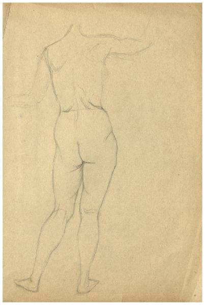 - NOTIZIE STORICO CRITICHE Questo disegno è in relazione con il progetto per un'acquaforte, mai realizzata, raffigurante il Pianeta Marte. La tavola avrebbe dovuto far parte di una serie dedicata ai sette pianeti, di cui soltanto tre allegorie furono effettivamente tradotte in stampa (Venere, 1924; Giove, 1926 circa; Mercurio, 1947-48; per una notizia sulla serie cfr. cat. Bellini-Alberti p. 58). La gestazione di questo lavoro impegnò moltissimo l'incisore, come attesta la messe di fogli nel Fondo Disertori al Gabinetto dei Disegni del Castello Sforzesco, dove sono almeno un centinaio le carte che si possono collegare al Pianeta Marte. La cronologia di questi lavori è difficile da stabilire: la prima idea per questa serie risale al 1923 (Maroni, 1954, p. 28), ma tracce di un intensificarsi dello studio di Marte si hanno, attraverso un carteggio inedito di Disertori con Cesare Olschki (Trento, Biblioteca Comunale, inv. 6044), verso il 1945 e fino al 1954 (in una lettera del 19 febbraio 1954 Disertori annuncia: "ho finito il disegno del Pianeta Marte che era arrivato ad un punto di stasi cronica, ma una modella adatta mi ha permesso di completare e correggere la danza delle nove Muse in primo piano"): per questa ragione, a questo primo livello di catalogazione si è risolto di proporre per tutti i disegni, fatto salvo per quelli datati, un arco cronologico ampio, dal 1923 al 1954. Nei due progetti più finiti (inv. FD D 436 e FD D 447) si vede nel cielo il dio della guerra addormentato; con il segno zodiacale dello Scorpione, sua casa primaria, da una parte, e in basso il segno dell'Ariete. La parte terrena della scena è ambientata in un giardino che una nota manoscritta su FD D 436 identifica con Villa Torlonia, dove in primo piano si intreccia una danza di muse: è a quest'ultima che si riferisce la maggior parte degli studi presenti nel Fondo Disertori, nelle principali varianti (si vedano oltre ai due fogli già citati almeno FD D 390 e FD D 393). Interessante come per la posa di Marte i primi studi evidenzino l'impiego di una modella, come peraltro si ricontra anche per altri personaggi maschili nell'ambito del corpus grafico dell'artista.