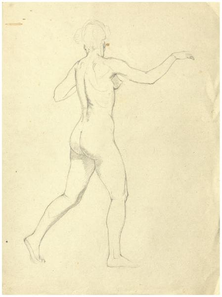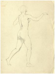 - NOTIZIE STORICO CRITICHE Questo disegno è in relazione con il progetto per un'acquaforte, mai realizzata, raffigurante il Pianeta Marte. La tavola avrebbe dovuto far parte di una serie dedicata ai sette pianeti, di cui soltanto tre allegorie furono effettivamente tradotte in stampa (Venere, 1924; Giove, 1926 circa; Mercurio, 1947-48; per una notizia sulla serie cfr. cat. Bellini-Alberti p. 58). La gestazione di questo lavoro impegnò moltissimo l'incisore, come attesta la messe di fogli nel Fondo Disertori al Gabinetto dei Disegni del Castello Sforzesco, dove sono almeno un centinaio le carte che si possono collegare al Pianeta Marte. La cronologia di questi lavori è difficile da stabilire: la prima idea per questa serie risale al 1923 (Maroni, 1954, p. 28), ma tracce di un intensificarsi dello studio di Marte si hanno, attraverso un carteggio inedito di Disertori con Cesare Olschki (Trento, Biblioteca Comunale, inv. 6044), verso il 1945 e fino al 1954 (in una lettera del 19 febbraio 1954 Disertori annuncia: "ho finito il disegno del Pianeta Marte che era arrivato ad un punto di stasi cronica, ma una modella adatta mi ha permesso di completare e correggere la danza delle nove Muse in primo piano"): per questa ragione, a questo primo livello di catalogazione si è risolto di proporre per tutti i disegni, fatto salvo per quelli datati, un arco cronologico ampio, dal 1923 al 1954. Nei due progetti più finiti (inv. FD D 436 e FD D 447) si vede nel cielo il dio della guerra addormentato; con il segno zodiacale dello Scorpione, sua casa primaria, da una parte, e in basso il segno dell'Ariete. La parte terrena della scena è ambientata in un giardino che una nota manoscritta su FD D 436 identifica con Villa Torlonia, dove in primo piano si intreccia una danza di muse: è a quest'ultima che si riferisce la maggior parte degli studi presenti nel Fondo Disertori, nelle principali varianti (si vedano oltre ai due fogli già citati almeno FD D 390 e FD D 393). Interessante come per la posa di Marte i primi studi evidenzino l'impiego di una modella, come peraltro si ricontra anche per altri personaggi maschili nell'ambito del corpus grafico dell'artista.