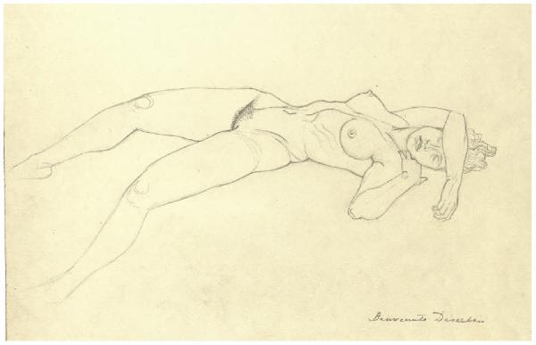 - NOTIZIE STORICO CRITICHE Questo disegno è in relazione con il progetto per un'acquaforte, mai realizzata, raffigurante il Pianeta Marte. La tavola avrebbe dovuto far parte di una serie dedicata ai sette pianeti, di cui soltanto tre allegorie furono effettivamente tradotte in stampa (Venere, 1924; Giove, 1926 circa; Mercurio, 1947-48; per una notizia sulla serie cfr. cat. Bellini-Alberti p. 58). La gestazione di questo lavoro impegnò moltissimo l'incisore, come attesta la messe di fogli nel Fondo Disertori al Gabinetto dei Disegni del Castello Sforzesco, dove sono almeno un centinaio le carte che si possono collegare al Pianeta Marte. La cronologia di questi lavori è difficile da stabilire: la prima idea per questa serie risale al 1923 (Maroni, 1954, p. 28), ma tracce di un intensificarsi dello studio di Marte si hanno, attraverso un carteggio inedito di Disertori con Cesare Olschki (Trento, Biblioteca Comunale, inv. 6044), verso il 1945 e fino al 1954 (in una lettera del 19 febbraio 1954 Disertori annuncia: "ho finito il disegno del Pianeta Marte che era arrivato ad un punto di stasi cronica, ma una modella adatta mi ha permesso di completare e correggere la danza delle nove Muse in primo piano"): per questa ragione, a questo primo livello di catalogazione si è risolto di proporre per tutti i disegni, fatto salvo per quelli datati, un arco cronologico ampio, dal 1923 al 1954. Nei due progetti più finiti (inv. FD D 436 e FD D 447) si vede nel cielo il dio della guerra addormentato; con il segno zodiacale dello Scorpione, sua casa primaria, da una parte, e in basso il segno dell'Ariete. La parte terrena della scena è ambientata in un giardino che una nota manoscritta su FD D 436 identifica con Villa Torlonia, dove in primo piano si intreccia una danza di muse: è a quest'ultima che si riferisce la maggior parte degli studi presenti nel Fondo Disertori, nelle principali varianti (si vedano oltre ai due fogli già citati almeno FD D 390 e FD D 393). Interessante come per la posa di Marte i primi studi evidenzino l'impiego di una modella, come peraltro si ricontra anche per altri personaggi maschili nell'ambito del corpus grafico dell'artista.