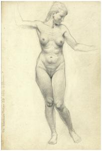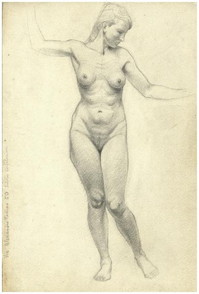 • NOTIZIE STORICO CRITICHE Questo disegno è in relazione con il progetto per un'acquaforte, mai realizzata, raffigurante il Pianeta Marte. La tavola avrebbe dovuto far parte di una serie dedicata ai sette pianeti, di cui soltanto tre allegorie furono effettivamente tradotte in stampa (Venere, 1924; Giove, 1926 circa; Mercurio, 1947-48; per una notizia sulla serie cfr. cat. Bellini-Alberti p. 58). La gestazione di questo lavoro impegnò moltissimo l'incisore, come attesta la messe di fogli nel Fondo Disertori al Gabinetto dei Disegni del Castello Sforzesco, dove sono almeno un centinaio le carte che si possono collegare al Pianeta Marte. La cronologia di questi lavori è difficile da stabilire: la prima idea per questa serie risale al 1923 (Maroni, 1954, p. 28), ma tracce di un intensificarsi dello studio di Marte si hanno, attraverso un carteggio inedito di Disertori con Cesare Olschki (Trento, Biblioteca Comunale, inv. 6044), verso il 1945 e fino al 1954 (in una lettera del 19 febbraio 1954 Disertori annuncia: "ho finito il disegno del Pianeta Marte che era arrivato ad un punto di stasi cronica, ma una modella adatta mi ha permesso di completare e correggere la danza delle nove Muse in primo piano"): per questa ragione, a questo primo livello di catalogazione si è risolto di proporre per tutti i disegni, fatto salvo per quelli datati, un arco cronologico ampio, dal 1923 al 1954. Nei due progetti più finiti (inv. FD D 436 e FD D 447) si vede nel cielo il dio della guerra addormentato; con il segno zodiacale dello Scorpione, sua casa primaria, da una parte, e in basso il segno dell'Ariete. La parte terrena della scena è ambientata in un giardino che una nota manoscritta su FD D 436 identifica con Villa Torlonia, dove in primo piano si intreccia una danza di muse: è a quest'ultima che si riferisce la maggior parte degli studi presenti nel Fondo Disertori, nelle principali varianti (si vedano oltre ai due fogli già citati almeno FD D 390 e FD D 393). Interessante come per la posa di Marte i primi studi evidenzino l'impiego di una modella, come peraltro si ricontra anche per altri personaggi maschili nell'ambito del corpus grafico dell'artista.