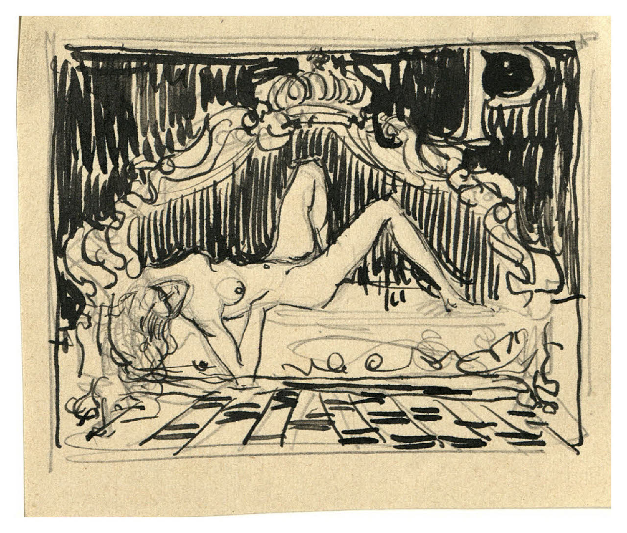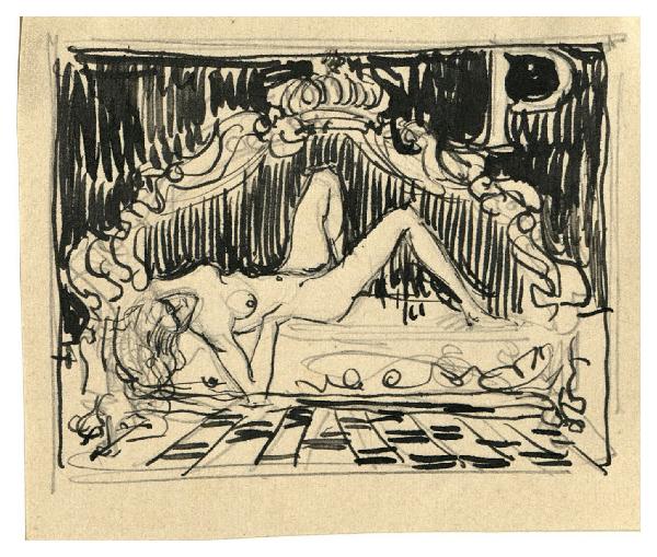 Nudo femminile disteso su un divano - Lettera P. Variante di per iniziale figurata di V. Pica, Acqueforti litografie e silografie di due giovani italiani, in Attraverso gli albi e le cartelle, [1921], p. 91