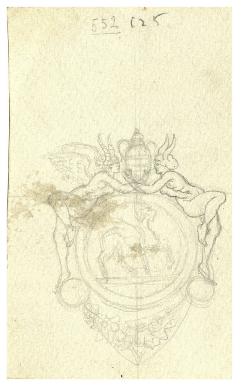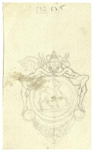 Scudo sormontato da due figure allegoriche (disegno preparatorio per la copertina di Massimo Gorki, La moneta falsa, Milano, Mondadori, 1927)