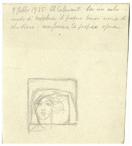 Studio di testa femminile e nota manoscritta: 9 febbr. 1935 Il Colasanti ha solo un modo di tutelare...