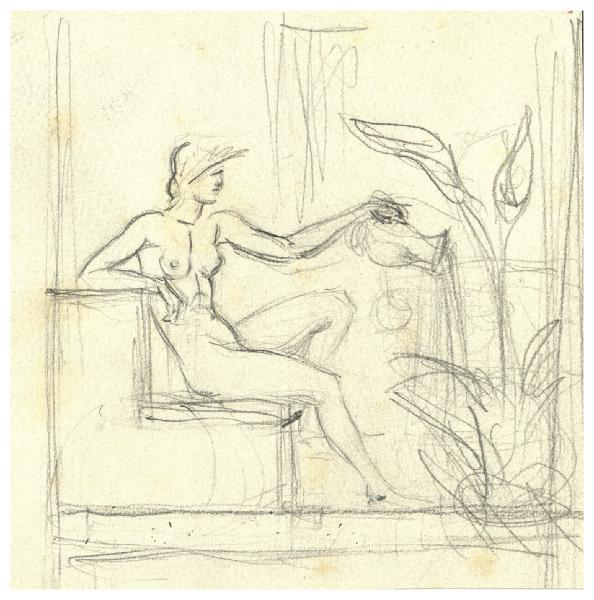 Figura femminile nuda, seduta, mentre annaffia una grande calla
