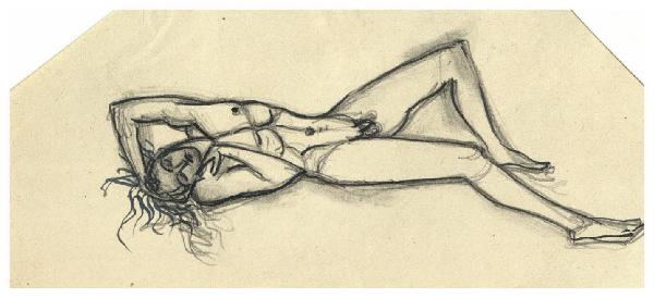 - NOTIZIE STORICO CRITICHE Questo disegno è in relazione con il progetto per un'acquaforte, mai realizzata, raffigurante il Pianeta Marte. La tavola avrebbe dovuto far parte di una serie dedicata ai sette pianeti, di cui soltanto tre allegorie furono effettivamente tradotte in stampa (Venere, 1924; Giove, 1926 circa; Mercurio, 1947-48; per una notizia sulla serie cfr. cat. Bellini-Alberti p. 58). La gestazione di questo lavoro impegnò moltissimo l'incisore, come attesta la messe di fogli nel Fondo Disertori al Gabinetto dei Disegni del Castello Sforzesco, dove sono almeno un centinaio le carte che si possono collegare al Pianeta Marte. La cronologia di questi lavori è difficile da stabilire: la prima idea per questa serie risale al 1923 (Maroni, 1954, p. 28), ma tracce di un intensificarsi dello studio di Marte si hanno, attraverso un carteggio inedito di Disertori con Cesare Olschki (Trento, Biblioteca Comunale, inv. 6044), verso il 1945 e fino al 1954 (in una lettera del 19 febbraio 1954 Disertori annuncia: "ho finito il disegno del Pianeta Marte che era arrivato ad un punto di stasi cronica, ma una modella adatta mi ha permesso di completare e correggere la danza delle nove Muse in primo piano"): per questa ragione, a questo primo livello di catalogazione si è risolto di proporre per tutti i disegni, fatto salvo per quelli datati, un arco cronologico ampio, dal 1923 al 1954. Nei due progetti più finiti (inv. FD D 436 e FD D 447) si vede nel cielo il dio della guerra addormentato; con il segno zodiacale dello Scorpione, sua casa primaria, da una parte, e in basso il segno dell'Ariete. La parte terrena della scena è ambientata in un giardino che una nota manoscritta su FD D 436 identifica con Villa Torlonia, dove in primo piano si intreccia una danza di muse: è a quest'ultima che si riferisce la maggior parte degli studi presenti nel Fondo Disertori, nelle principali varianti (si vedano oltre ai due fogli già citati almeno FD D 390 e FD D 393). Interessante come per la posa di Marte i primi studi evidenzino l'impiego di una modella, come peraltro si ricontra anche per altri personaggi maschili nell'ambito del corpus grafico dell'artista.