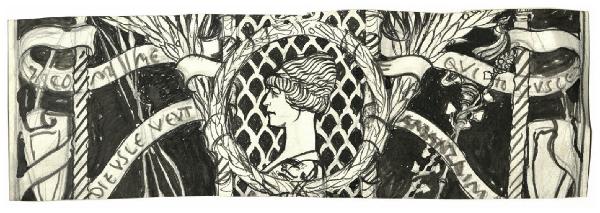 - NOTIZIE STORICO CRITICHE Elementi per la datazione di questa composizione si possono trarre dal confronto con una versione a disegno del solo ritratto femminile, fissato su una busta da lettera con timbri postali che recano la data 1915 (inv. FD D 560). Un'ipotesi per l'identificazione del personaggio raffigurato con Rosanna Rizzi Gorra è suggerito da uno schizzo a matita con il solo medaglione centrale (inv. FD D 1354). Infine una traccia interpretativa circa la destinazione di questo progetto, forse per un cofanetto decorativo, ci è suggerito dalla presenza, sullo stesso Album di uno dei disegni che formano questa serie di studi (inv. FD Album 9,15), con due figurazioni simili (inv. FD Album 9, 16-17).\n