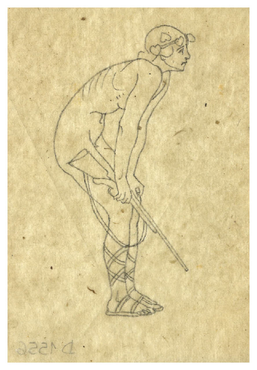 Nudo chinato in avanti con corona d'edera sul capo e un fucile in mano