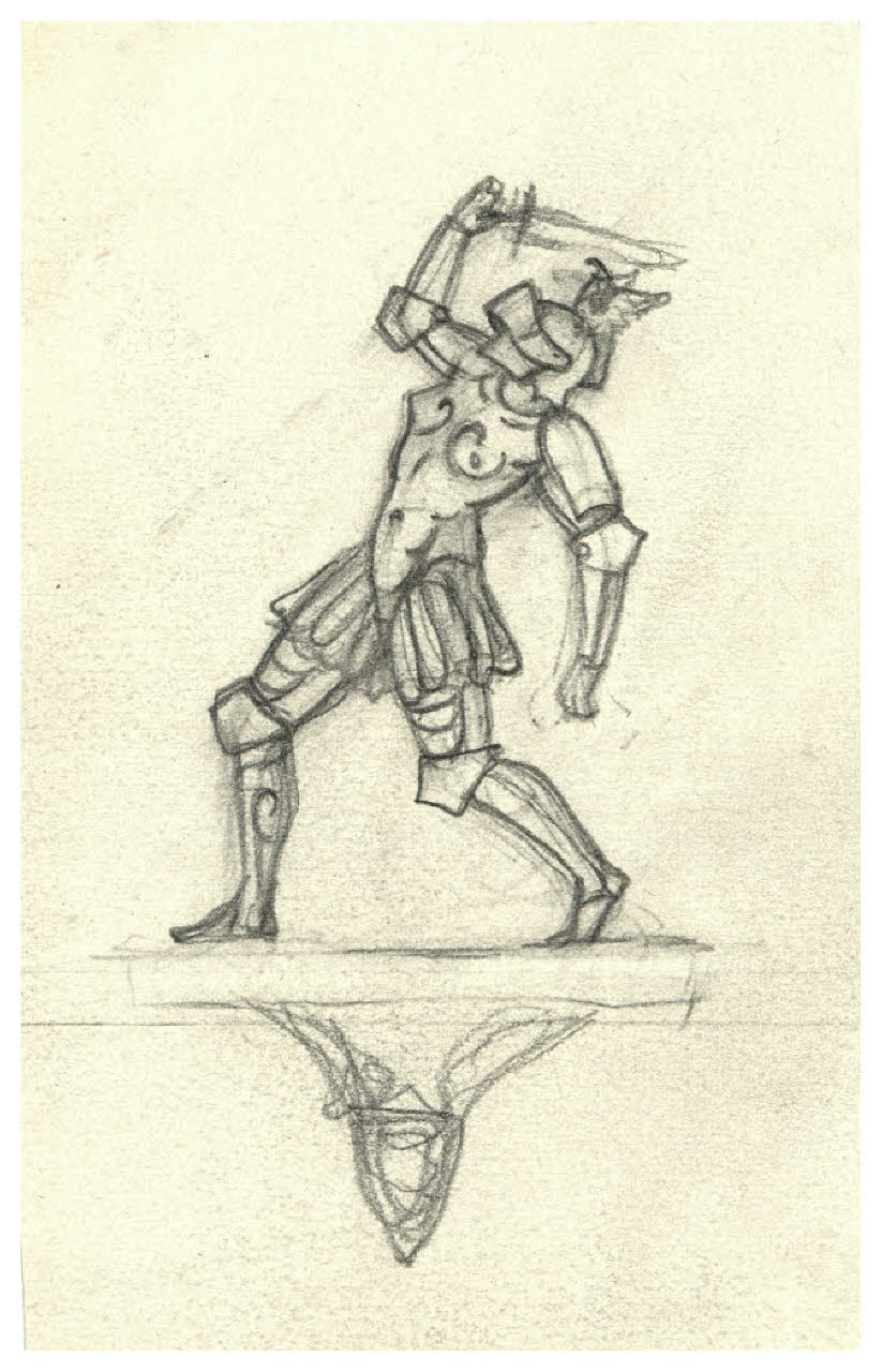 Guerriero in armatura che avanza verso sinistra con la spada alzata. Studio per illustrazione