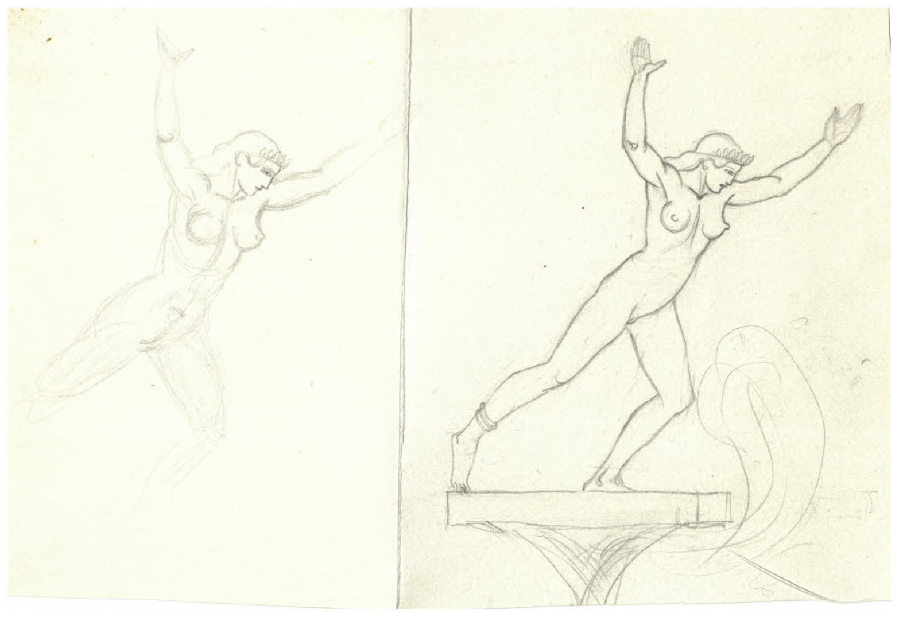 Studio di figura femminile con le braccia alzate che avanza. Disegno preparatorio per Gian Francesco Malipiero, Ecuba: tragedia in tre atti da Euripide, Milano, Suvini Zerboni, 1940 (?)