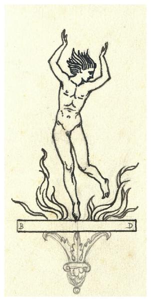 Figura maschile nuda tra le fiamme. Studio per illustrazione