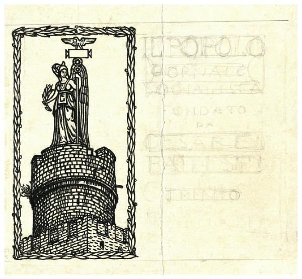 Torre di Augusto a Trento - Il Popolo: giornale socialista fondato da Cesare Battisti, Trento. Disegno preparatorio per la tessera dei corrispondenti del giornale