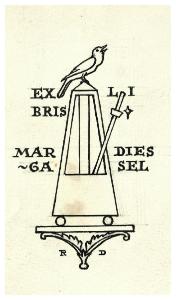 - NOTIZIE STORICO CRITICHE Disegno preparatorio per l'ex libris per Marga Diessel (Bellini-Alberti 150), realizzato con tecnica tipografica. Il monogramma in basso porta le iniziali di Regina Disertori.\n