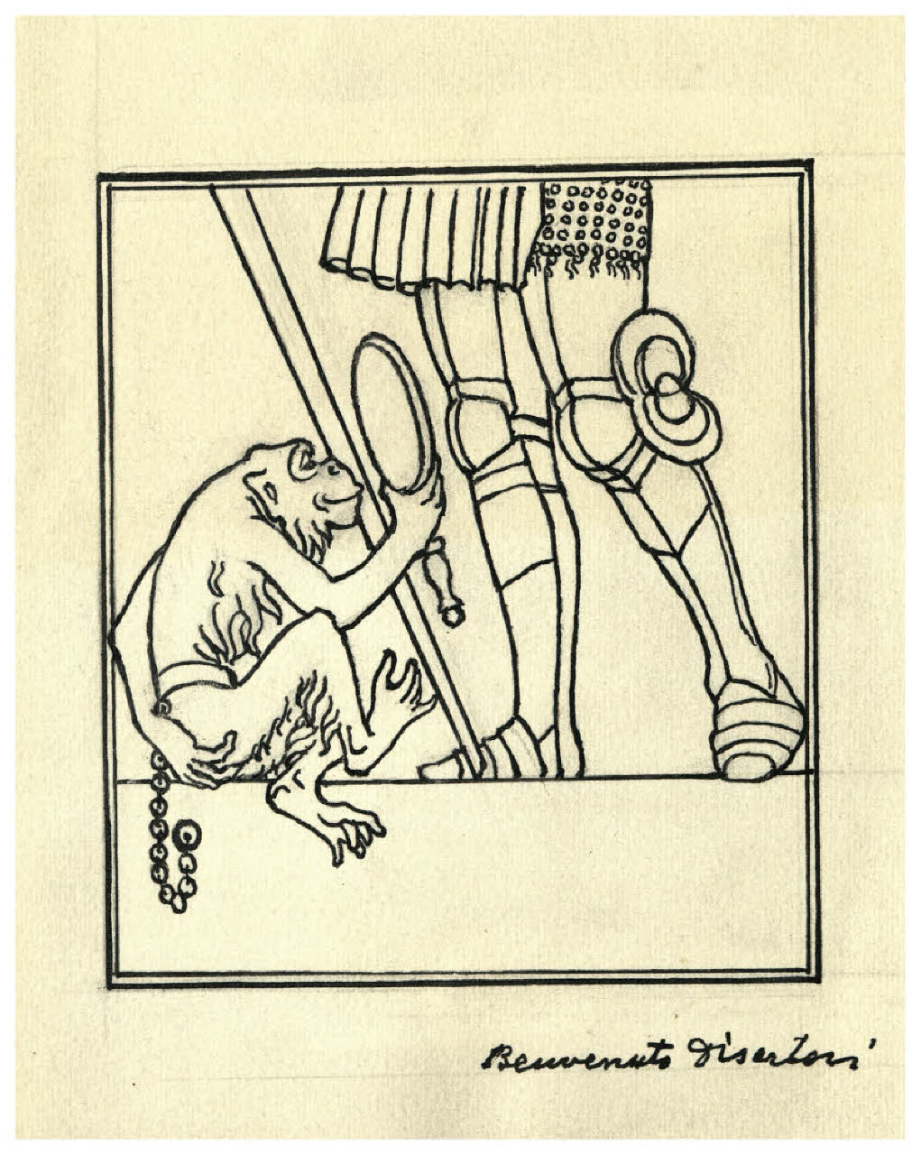 Scimmia con uno specchio e gambe di un uomo in armatura. Studio per illustrazione