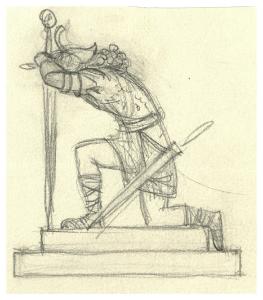 Guerriero in ginocchio davanti ad una spada. Studio per illustrazione