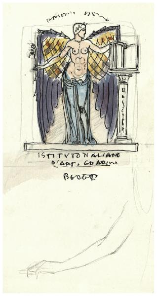 Gloria che sfoglia un libro aperto posto sopra una colonnina. Disegno preparatorio per una marca dell'Istituto d'Arti Grafiche di Bergamo