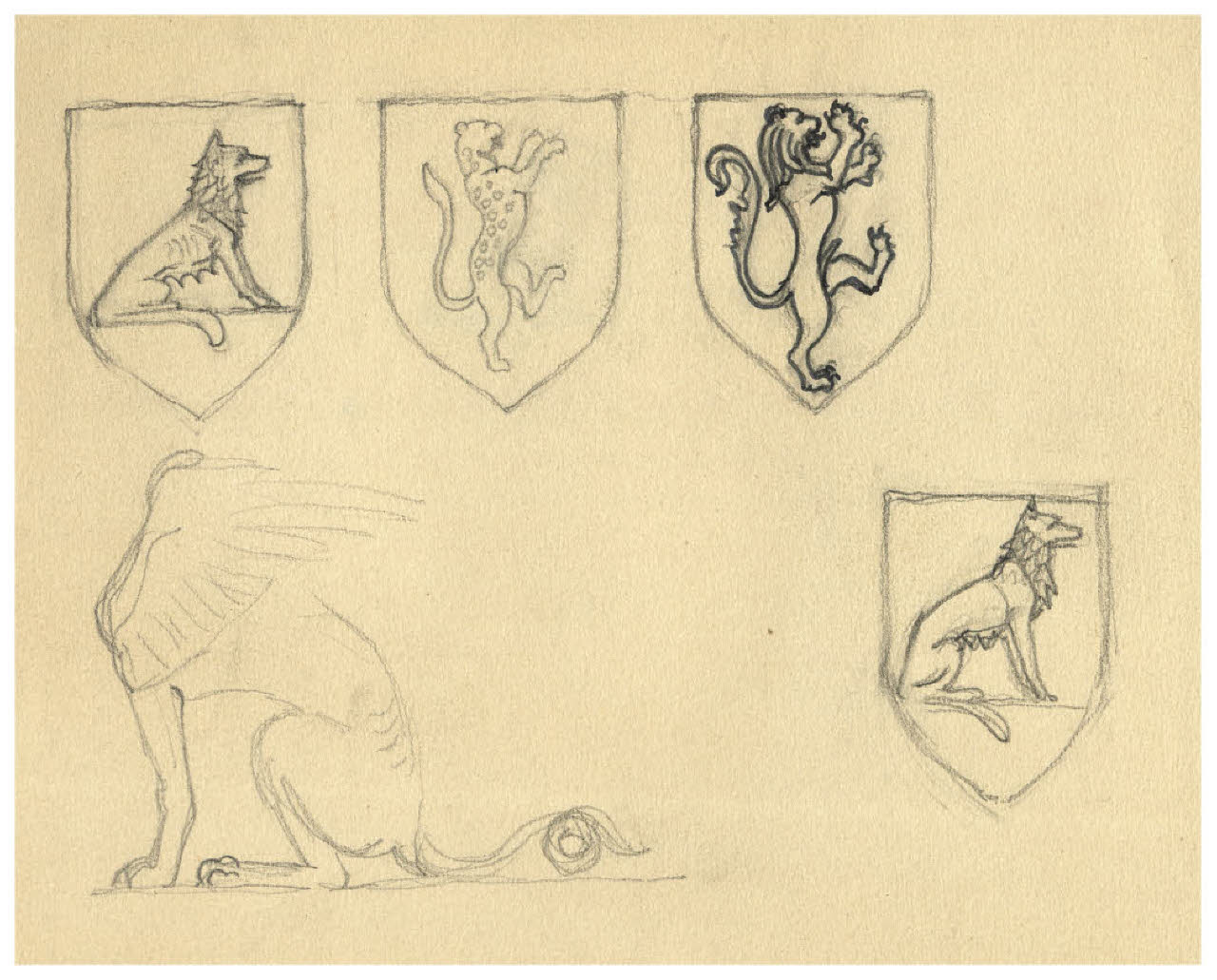 Sfinge. Disegno preparatorio per la copertina di Luigi Pirandello, Tutti i romanzi, Milano, Mondadori, 1957; Stemmi con animali rampanti. Disegno preparatorio per la copertina di Giovanni Pascoli, Prose, Milano, Mondadori, 1952
