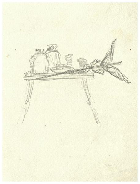 Natura morta con caduceo su un basso tavolo. Studio per illustrazione