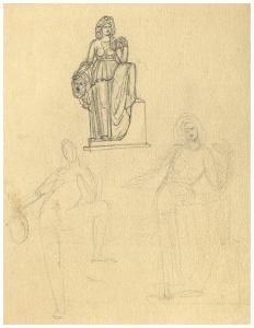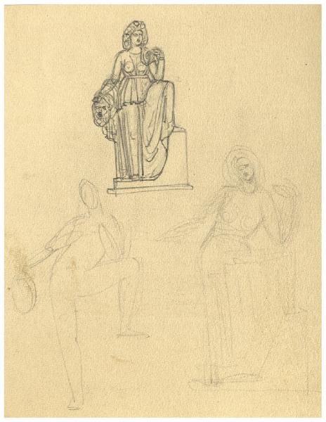 Figura femminile abbigliata all'antica con in mano un mascherone. Studio per illustrazione