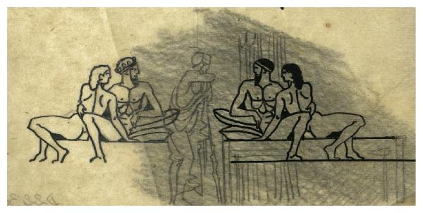 Scena con figure all'antica, una stante e due amanti. Variante di studio per la testata dell'atto terzo di Raffaele Calzini, La tela di Penelope, Milano, Mondadori, 1922 ?