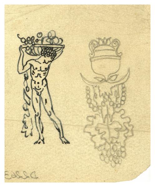 Nudo maschile; Motivo decorativo con bucranio. Disegno preparatorio per la cornice di un menu
