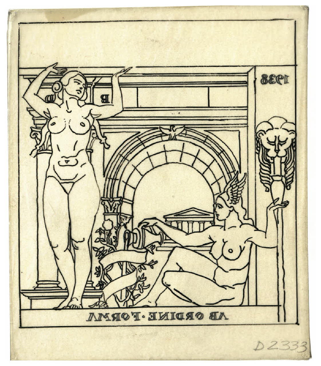 Nudi femminili e arco - Ab ordine forma (disegno preparatorio per l'ex libris per Gianni Mantero)