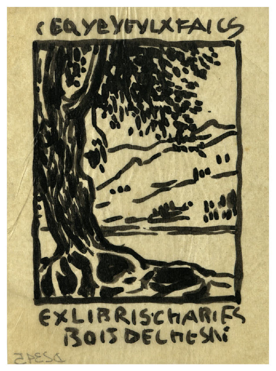 Quercia e paesaggio - Ce que veulx faics (disegno preparatorio per l'ex libris di Charles Bois de Chesne - pseud. Carlo Querceto)