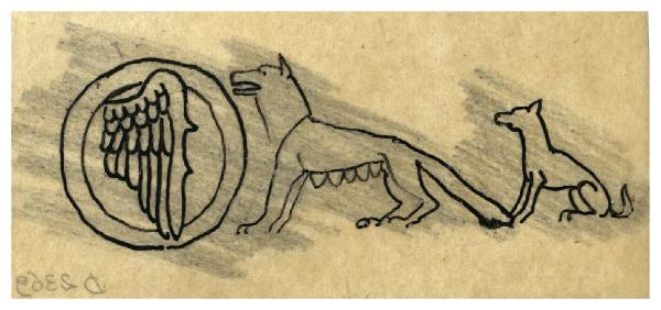 Fregio con quattro fiere, tra cui un leone e una lupa, al centro stemma con un'ala, frammento. Studio per testata del Canto I della Divina Commedia
