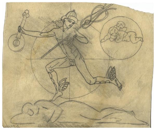 - NOTIZIE STORICO CRITICHE Questo disegno è in relazione con la genesi dell'acquaforte del 1947-1948 Il Pianeta Mercurio (Bellini-Alberti 61). La stampa mostra nella parte inferiore una veduta della zona industriale della Bovisa (per la quale si rinvia al contributo di Andrea Disertori, 2010) e nel cielo il Pianeta Mercurio in una posa scattante (simile a quella già esperita nel progetto del francobollo per la posta aerea del 1930; cfr. Salierno 1981) affiancato dai segni zodiacali della sua casa principale, la Vergine, e quella secondaria, i Gemelli. Attraverso il Fondo Disertori del Gabinetto dei Disegni del Castello Sforzesco si può seguire la genesi del soggetto, dai primi schizzi per la composizione, fino ai più analitici studi di dettaglio, compresa una serie di calchi su carta da lucido, dei quali ancora non è ben chiara la funzione.