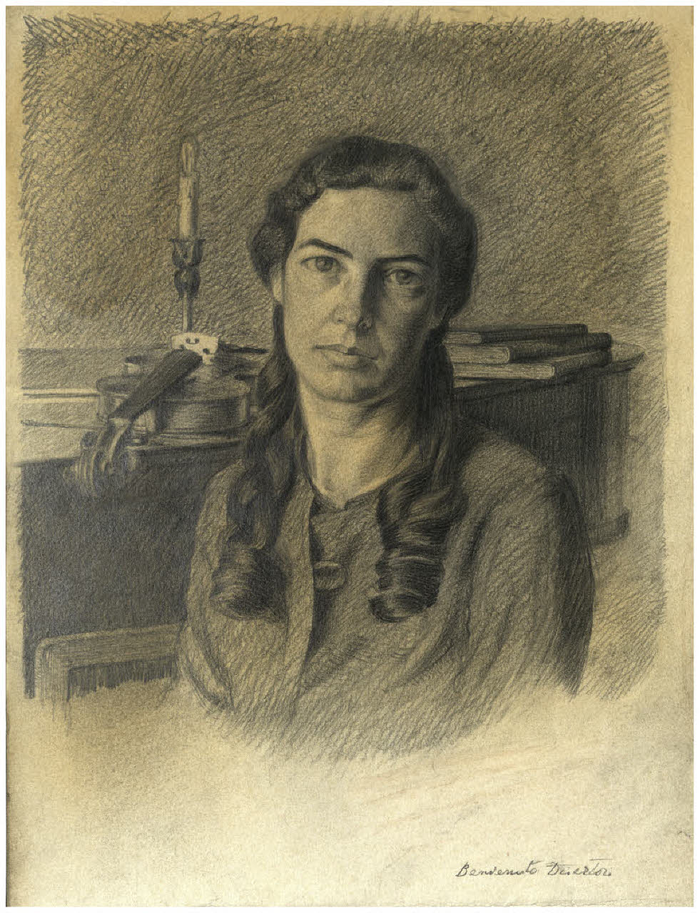 - NOTIZIE STORICO CRITICHE Nel 1943 Disertori ha realizzato più di un ritratto di Daonella Trener, nipote di Cesare Battisti. Quello qui catalogato non corrisponde ai due pubblicati nel catalogo Del Prato-Bragaglia del 1995 (fig. 64 a p. 116 e fig. 65 a p. 117), anche se rispetto al secondo il soggetto è quasi identico, ancorchè speculare.\n