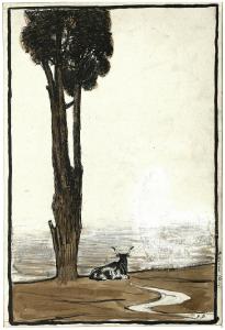 Paesaggio con albero e bue maremmano