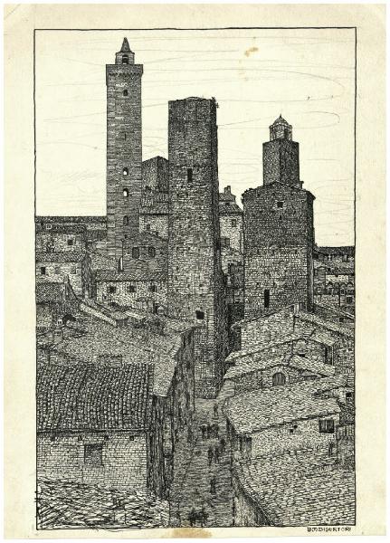 - NOTIZIE STORICO CRITICHE Disegno preparatorio per l'acquaforte San Gimignano (Bellini-Alberti 28, con una datazione al 1917-1918). Maggiori dettagli circa l'epoca di esecuzione dell'incisione provengono ora da una nota manoscritta dell'artista (XVI. S. Gemignano piccolo [19]13-16) presente su un Album del Fondo Disertori al Gabinetto dei Disegni, che contiene una lista dei suoi lavori fino al 1917 circa (FD Album 10, 6). \n