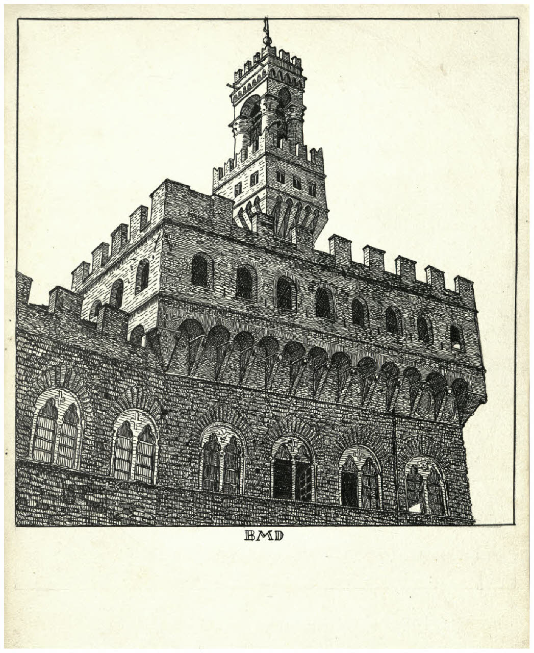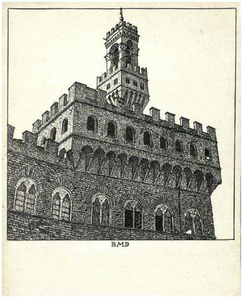 - NOTIZIE STORICO CRITICHE Disegno preparatorio per l'acquaforte Palazzo della Signoria a Firenze (Bellini-Alberti 19, con una datazione al 1916). Maggiori dettagli circa l'elaborazione della stampa provengono da una nota manoscritta dell'artista ("XIII. Firenze. Merlatura e torre del Palazzo Vecchio 1912-1913") presente su un Album del Fondo Disertori al Gabinetto dei Disegni, che contiene una lista dei suoi lavori fino al 1917 circa (FD Album 10, 6). \n