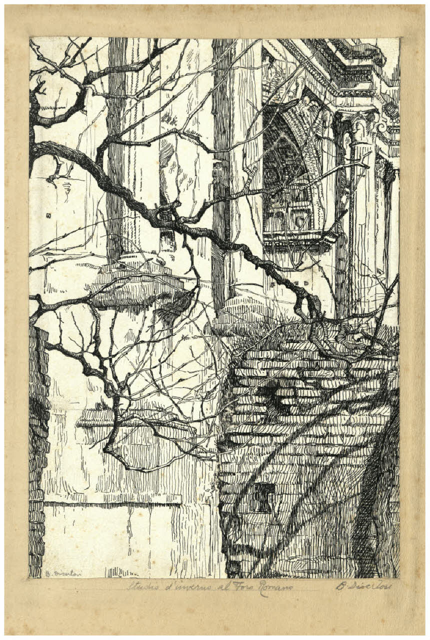 - NOTIZIE STORICO CRITICHE Disegno preparatorio per l'acquaforte L'arco di Settimio Severo e la cupola di S. Luca (Bellini-Alberti 25): maggiori dettagli circa la datazione della stampa provengono ora da una nota manoscritta dell'artista ("XVIII. Arco di Settimio [19]17") presente su un Album del Fondo Disertori al Gabinetto dei Disegni, che contiene una lista dei suoi lavori fino al 1917 circa (FD Album 10, 6). \n