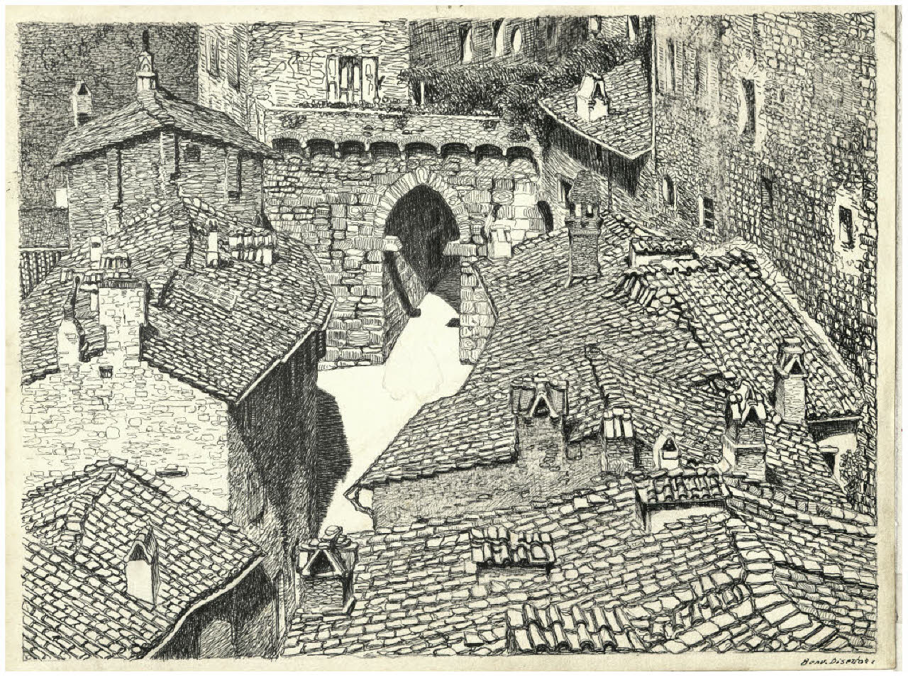 - NOTIZIE STORICO CRITICHE Disegno preparatorio per l'acquaforte Perugia. La porta dell'arco della Mandola (Bellini-Alberti 5), con una datazione al 1912-1913. Maggiori dettagli circa la sua elaborazione provengono da una nota manoscritta dell'artista ("V. Perugia. Porta eburnea ossia Arco della Mandola 1911-1913") presente su un Album del Fondo Disertori al Gabinetto dei Disegni, che contiene una lista dei suoi lavori fino al 1917 circa (FD Album 10, 6). \n