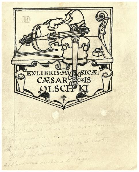 - NOTIZIE STORICO CRITICHE Disegno preparatorio per l'ex libris musicae di Cesare Olschki (Bellini-Alberti 151).\n