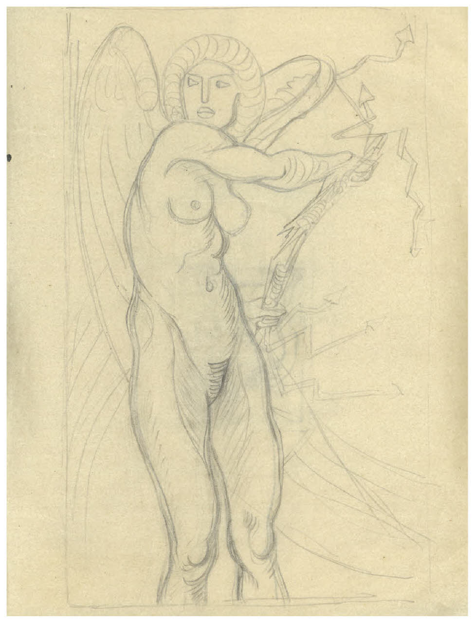 - NOTIZIE STORICO CRITICHE L'album nel quale si trova questo disegno è databile verso il 1913-14 grazie alla presenza di alcuni studi chiaramente in relazione con opere di questo periodo, tra cui il frontespizio per l'opera non pubblicata Canti milanesi (Bellini-Alberti 81), un ex libris (Bellini-Alberti 100) e un'illustrazione per il Decameron (carta 14; rif. Bellini-Alberti 83.8).\nNelle ulteriori elaborazioni del soggetto qui delineato compare una citazione desunta dagli Emblemi dell'Alciato: Aligerum fulmen fregit deus aliger, igne; Dum demonstrat uti est fortior ignis amor. Questa citazione è tra quelle di cui l'artista aveva preso nota alla carta 17 di questo album.