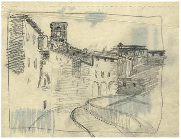 - NOTIZIE STORICO CRITICHE L'album del quale fa parte il disegno qui schedato può datarsi alla prima metà degli anni Dieci, dopo il rientro in Italia nel 1911, quando Disertori intraprende una serie di viaggi e conosce le città medioevali del centro Italia. Vi si riconoscono infatti vedute di San Gimignano e Perugia. Sono inoltre presenti disegni destinati a progetti editoriali come il Decameron per le edizioni Formiggini (edito nel 1916, ma in preparazione dal 1913-14), la Leggenda di San Basilio di Ildebrando Pizzetti (1912), e Frammenti vissuti di Torello Fanciullacci per la Tipografia emiliana a Venezia (1913).