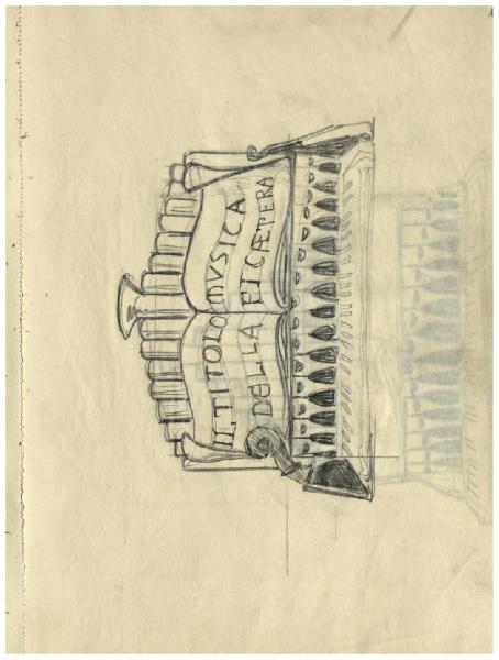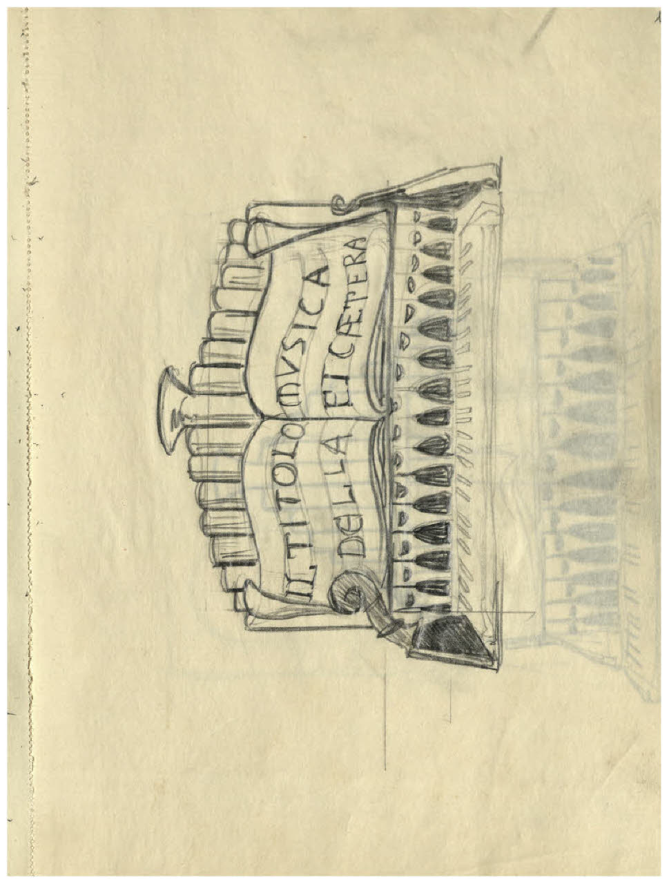 Spartito aperto e canne d'organo - Il titolo della musica et caetera. Disegno preparatorio per il frontespizio di Ildebrando Pizzetti, La leggenda di Santo Basilio, 1912