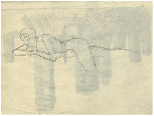 - NOTIZIE STORICO CRITICHE L'album del quale fa parte il disegno qui schedato può datarsi alla prima metà degli anni Dieci, dopo il rientro in Italia nel 1911, quando Disertori intraprende una serie di viaggi e conosce le città medioevali del centro Italia. Vi si riconoscono infatti vedute di San Gimignano e Perugia. Sono inoltre presenti disegni destinati a progetti editoriali come il Decameron per le edizioni Formiggini (edito nel 1916, ma in preparazione dal 1913-14), la Leggenda di San Basilio di Ildebrando Pizzetti (1912), e Frammenti vissuti di Torello Fanciullacci per la Tipografia emiliana a Venezia (1913).